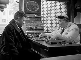 House was a particular favorite of actor/director Orson Welles, who employed him on three occasions: The Stranger (1946), The Fountain of Youth (1956) and Touch of Evil (1958).[16][17] Indeed, Welles had long watched House's burlesque career before initially casting him in The Stranger. While working with him on that first film, Welles came to know House as a "very funny man" possessed of "great old-fashioned slang that I've treasured through the years". His character — a comic druggist who played checkers — was not initially a major part of the film, but Welles became so enamored of House's talents, that the character's importance grew with last-minute script additions on the set. These revisions came at the expense of Edward G. Robinson's character, causing the more famous actor to complain ineffectually to studio executives.[3] In the end, The Stranger was, according to Welles, "House's picture".[18]