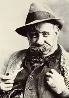 After the war he continued to perform the act as "Old Bill", with Bairnsfather's endorsement,[3] initially in theatres run by his father in Hertfordshire. On realising that many in his audience did not want to be reminded of the war, he modified the act to become "Old Bill in Civvies", and was sometimes billed as "The Son of Toil". Stephen Dixon writes: "A walrus moustache covered his mouth and a good part of his chin. He dressed like a traditional workman from the 1920s, with a squashed and oil-grimed hat, hobnailed boots, collarless shirt with red handkerchief tied around the throat, moleskin trousers secured just below the knee with string. He would clear his throat and address the audience in a crackly Birmingham whine: 'On behalf of the working classes...'"[1] He often improvised his performance in character, extemporising from the latest newspaper headlines and commenting on political events.[3][4]