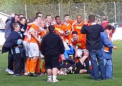 Bilston Town players celebrate beating Haughmond 4–1 to gain promotion to the WM(R)L Premier Division in May 2013