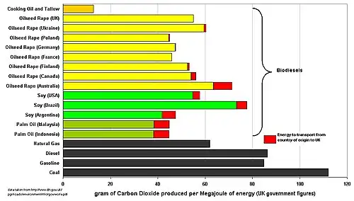 Graph of UK figures for the Carbon Intensity of Biodiesels and fossil fuels. It assumes biodiesel is transported to the UK to be burnt.[2]