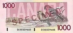 The pink-hued $1000 banknote has an obverse with the same portrait of Elizabeth II used on the $2 banknote adjacent to a vignette of the Centre Block and Library of Parliament, the modern flag of Canada flying from the Peace Tower.[15][27] The reverse features a pair of pine grosbeaks, the engraving of which was based on a watercolour by John Crosby.[27] Originally, it was intended to use an image of a spruce grouse, but its nickname "fool hen" was "considered too controversial".[27] This was the first new $1000 bill printed since the 1954 Canadian Landscape series.