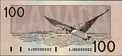 | $100 | Brown | Robert Borden | Canada goose | 1988 | 3 December 1990 | 17 March 2004 |