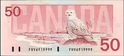 The obverse of the red $50 banknote includes William Lyon Mackenzie King, and the reverse has the snowy owl depicted on a background of an Arctic landscape.[12] This portrait was also engraved by Thomas Hipschen, and was placed adjacent to the Parliament buildings flying the Canadian Red Ensign.[27] The colour of this banknote differed slightly from the same denomination in the Scenes of Canada series, as its hue was blue-red instead of the earlier banknotes orange-red.[27]