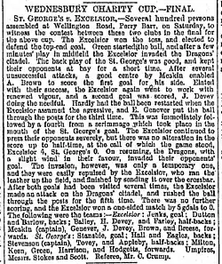 The club's only significant trophy success came in the Wednesbury Charity Cup in 1884–85, Excelsior beating Stafford Rangers 6–1 in the semi-final[5] and upsetting Mitchells St George's 5–0 in the final, four of the goals coming in the first half; Jack Devey was one of the Excelsior scorers.[6]