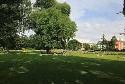The Birskopf bridge (Birskopfsteg) connects the meadows at both Birs riverbanks and was constructed in 1963 as the first cable-stayed bridge in Switzerland. In 2007 the bridge was demolished due to a broken cable. A makeshift wooden bridge was built in 2008, and a permanent new bridge was opened in April 2012.[1]