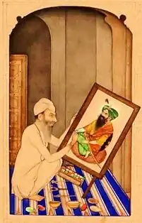 Bishan Singh's style included vivid greens, yellows, and blues.[15] Meticulous detail was placed upon the depicted scene, especially regarding figures, botany, and architecture.[15][16] He often depicted tradespeople living their daily lives.[16] Bishan Singh was influenced by the Company School.[16] Furthermore, he came under the influence of the style of realism that had been introduced by the Europeans.[16] Bishan Singh was skilled in arabesque and was responsible for the commencement of fresh and bright brush strokes.[11] Bishan Singh was talented in depicting courtly durbar scenery.[17] However, his self-portrait differs in-style greatly from his durbar painting, with his self-portrait showing strong European and Western influence, where he uses the standard codes of European portraiture.[8] In his self-portrait, the material and mode he utilized was watercolour on cardboard, with him facing and looking directly at the viewer from the front, with his physical characteristics and facial features portrayed as aged and realistic, which is in-line with the Western method of portraiture.[8]