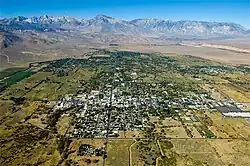 An aerial view of Bishop, looking west. Line Street, Bishop's main East-West Street, is in center left, running from the bottom of the photo into the distance