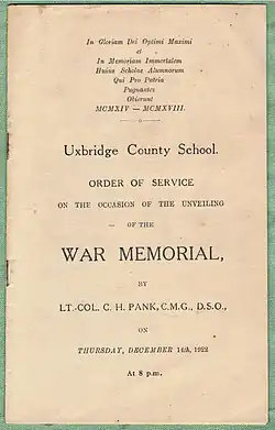 The current building within which the school is housed was built in 1858.[1] The school dates back to 1907 when it was first established as Uxbridge County School in The Greenway.[2] It was designed by the architect H. G. Crothall for the Middlesex Education Committee.[3] The Committee purchased the present site for £6900 in 1925 and in 1928 the school moved there.[2] The original buildings in The Greenway became part of Uxbridge High School.[4] On 6 October the school was officially opened by Sir John Reith, the Director-General of the BBC.[5]