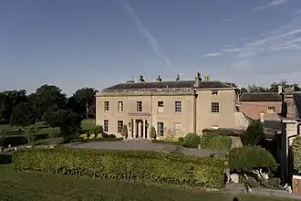 A manor house was built at Bishopstrow in the late eighteenth century, between the Salisbury road and the River Wylye, but was destroyed by fire in 1817. The present-day house was then begun for William Temple on the north side of the road, nearer to the escarpment of Salisbury Plain,[1] and was completed by John Pinch the elder in 1821.[2][3] The gardens of the earlier house were retained and are linked to the new site by a tunnel under the road.[4]