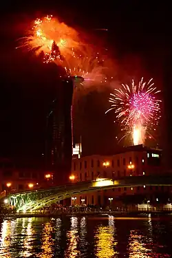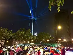 The fireworks display was held at the 52th Floor, the helipad of the tower; and on the 68th floor, top of the tower. It was believed to have firework and laser lights show in the arguation day; however, only the laser light show occurred.