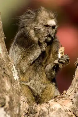 The black-tufted marmoset diet consists primarily of tree sap, which it obtains by nibbling the bark with its long lower incisors. In periods of drought, it will also include fruit and insects in its diet. In periods of serious drought, it has also been known to eat small arthropods, molluscs, bird eggs, baby birds and small vertebrates.