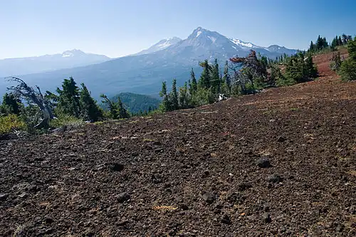 Black Crater is a shield volcano,[5][23][24][nb 1] composed of mafic[25][9] basaltic andesite[5][26][27] and olivine basalt.[11] It is part of a group of mafic shield volcanoes in central Oregon that also includes North Sister, Mount Washington, Broken Top,[10] and Black Butte.[28] Black Crater shows high amplitude positive polarity on magnetic anomaly maps, as do Mount Washington, Three Fingered Jack, and Mount Jefferson, suggesting an age of less than 730,000 years.[29] The volcano was likely formed in the late Pleistocene[2] and has not erupted for about 50,000 years.[30] Near the end of its eruptive activity, the volcano formed cinder cones on its southwestern side and a parasitic lava cone near its western base. Scoria and agglomerate near the summit vent was likely erupted at the same time as these formations and have been intruded by dikes.[11] Later, additional cinder cones formed on the volcano, including one at the southern base known as Millican Crater,[11] which erupted basalt.[31] Millican Crater runs up against Black Crater, with a width of 3,900 feet (1,200 m). It erupted a lava flow with dimensions of 1.2 by 1.9 miles (2 by 3 km), which runs south and east and has been moderately eroded by glaciers. This lava flow is made of scoria and agglutinate.[32]