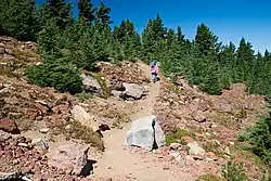 Some Arctic–alpine plants can be found in the area around Black Crater above the timberline.[17] The north side of Black Crater has thick stands of mountain hemlock,[13] while the eastern side supports ponderosa pine and bitterbrush. On the western side, there is forest with mountain hemlock and Pacific silver fir.[6]