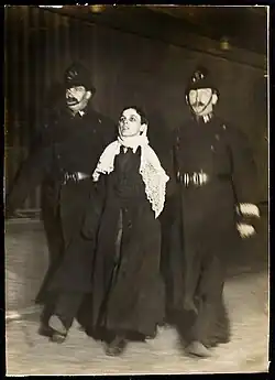 Groups approaching Parliament Square were met at the Westminster Abbey entrance to the square by groups of bystanders, who manhandled the women. As they moved past the men, the suffragettes were met by lines of policemen who, instead of arresting them, subjected them to violence and insults, much of which was sexual in nature. The demonstration continued for six hours; police beat women attempting to enter parliament, then threw them into the crowds of onlookers, where they were subjected to further assaults.[56] Many of the suffragettes considered that the crowds of men who also assaulted them were plain clothes policemen.[57] Caxton Hall was used throughout the day as a medical post for suffragettes injured in the demonstration. Sylvia Pankhurst recorded that "We saw the women go out and return exhausted, with black eyes, bleeding noses, bruises, sprains and dislocations. The cry went round: 'Be careful; they are dragging women down the side streets!' We knew this always meant greater ill-usage."[58] One of those taken down a side street was Rosa May Billinghurst, a disabled suffragette who campaigned from a wheelchair. Police pushed her into a side road, assaulted her and stole the valves from the wheels, leaving her stranded.[59] The historian Harold Smith writes "it appeared to witnesses as well as the victims that the police had intentionally attempted to subject the women to sexual humiliation in a public setting to teach them a lesson".[60]
