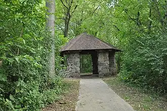 On November 15, 1990, three areas of the park were listed on the National Register of Historic Places. Their historic importance is derived from their association with the CCC. The park was part of a larger study of Iowa's state parks called Civilian Conservation Corps Properties in Iowa State Parks: 1933-1942.[4] Area A focuses on the wildlife preserve that includes the fish rearing ponds, a latrine, and infrastructure such as steps, a bench, and a paved road. Area B includes a picnic shelter, latrine, drinking fountain and incinerator.[5] Area C is a picnic shelter and latrine building.[6] The Rustic style was used in the design of the buildings. The significance of this architectural style is that it was designed to blend into its natural surroundings by means of its material, design, and workmanship.[3] Areas A and B are historic districts, while Area C is an individual listing.