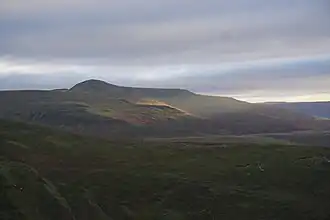 In his description of a Blak Montayne, the antiquarian John Leland refers to a massif extending between Carmarthen and Monmouth i.e. what is now considered to be the Brecon Beacons in the wider modern sense of that term, thus including the Black Mountain far to the west and the intervening high ground. There is a suggestion too that the names Hatterrall Hill and Mynydd y Gader may also once have been used to apply to the entire range of the Black Mountains though the former later became confined to the vicinity of its eastern ridge. The latter is now recognised in Pen y Gader-fawr (Pen y Gadair Fawr) and Gader Fawr (Gadair Fawr); names applied to the hill at SO 229288. Cadair, mutated to 'gadair' and anglicised as 'gader', means 'seat' or 'chair' in Welsh.[1][2] The Welsh name for these hills is traditionally Y Mynydd Du ('the black mountain') though in more recent times the name Y Mynyddoedd Duon ('the black mountains') has been used, being a retranslation from the English.[3]