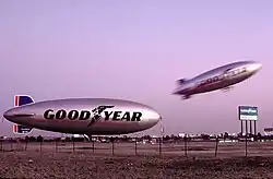 Goodyear granted the film use of all three of its U.S.-based blimps for Black Sunday. The blimps were flown by company pilots Nick Nicolary and Corky Belanger Sr., among the five pilots who were involved in the production.[12] The landing and hijacking scenes were filmed at Goodyear's blimp base along Interstate 405 in Carson, California, with the Columbia (N4A). The America (N10A) appeared in a short scene filmed at the Goodyear base at Spring, Texas. The extensive Miami Super Bowl scenes were shot with the blimp Mayflower (N1A), which was of a different design and is noticeably smaller than the Columbia and America. The Mayflower was then based on Watson Island across the Port of Miami.[13] While Goodyear allowed the use of their airship fleet in the film, they did not allow the "Goodyear Wingfoot" logo (prominently featured on the sides of the blimp) to be used in any advertising or movie posters. Thus, the words "Super Bowl" are featured in place of the logo on the blimp in all advertising for the film.[14]