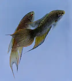 The black paradisefish (Macropodus spechti) is a species of gourami endemic to Vietnam. It is an inhabitant of hill streams, lowland streams, and irrigation ditches in farmland. This species grows to a standard length of 5.8 cm (2.3 in).[2] It is found in the Thu Bon River and Perfume River; its habitat is hill streams, along backwaters of large rivers and small stream and irrigation channels on farmland. Aside from possibly being used as an ornamental fish, nothing else is known about the species.