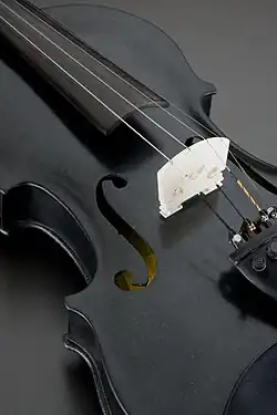 The sound box of the violin is 2.5 mm (0.098 in) thick. It was made with highest precision and constructed with sound-holes, back and graceful scroll. The ribs (sound box wall) were made in one piece by first sawing out a 30 mm (1.2 in) thick plate shaped to form the external violin contour. Then the inside was removed using a waterjet and machined with hand tools to create a thin rib, no more than a couple of millimetres thick at its thinnest point. The interior of the box was gilded with gold. The fingerboard is made of ebony. Precision bonding of the sound box parts was done using two component glue and the neck secured with two silvered steel pins where it joins the body. The bridge is formed from a piece of mammoth ivory from Siberia, the yellowest available, symbolising the blackbird's yellow beak.[1]