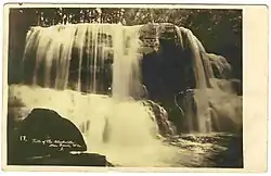 Travel writer Philip Pendleton Kennedy described the Blackwater Canyon for a popular readership in 1853 but somehow managed to miss the Falls.[6] The same year however, his companion and cousin, the illustrator David Hunter Strother ("Porte Crayon"), published "The Virginia Canaan" about his adventures in the Blackwater Country and the Falls entered the literature for the first time.[7][NB 2] Strother also published a more lengthy description of his June 1852 visit in an article called "The Mountains".[8] The Dobbin House was built near the Falls in 1858 and provided a popular lodge for visitors to the Falls during the 1860s and '70s.[5]: 596–597 A published account of a May 1879 visit to the Falls by recreationalists[9] further popularized the site.