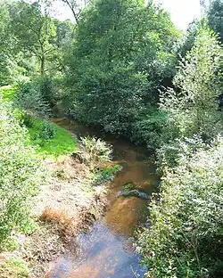 There are several areas of woodland, including Mill Covert, Robin Knight's Rough and Ash Coppice by Forge and Checkley Brooks, as well as Blakenhall Moss.[3][21] Some is ancient woodland: Ash Coppice has hazel, which was historically coppiced, together with some alder, with bluebells among the vegetation; Robin Knight's Rough has alder, with vegetation including bluebells, spindle and alternate-leaved golden saxifrage. Both woods are local wildlife sites.[23] Mill Covert is marked on tithe maps and might also be ancient.[24] Numerous small meres and ponds are scattered across the area, especially within the woodland.[3][21] Checkley Brook/Forge Brook, a tributary of the River Weaver, forms an important wildlife corridor.[25] The woodland of Blakenhall Moss, a Cheshire Wildlife Trust (CWT) nature reserve, was formerly a lowland raised bog, and has been managed by CWT to restore it to this state by interrupting drainage and felling trees, as part of the Meres and Mosses of the Marches Nature Improvement Area initiative funded by the Department for Environment, Food and Rural Affairs. The drier areas have oak and downy birch woodland with bluebells, and the area supports birdlife including marsh tits, owls and sparrowhawks.[23][26][27]