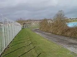 ![]() A view just outside the circuit, which crosses from the blue fence on the right beyond the hedge and through where the gate now stands in the centre. This point on the track was called "The Dip". | |