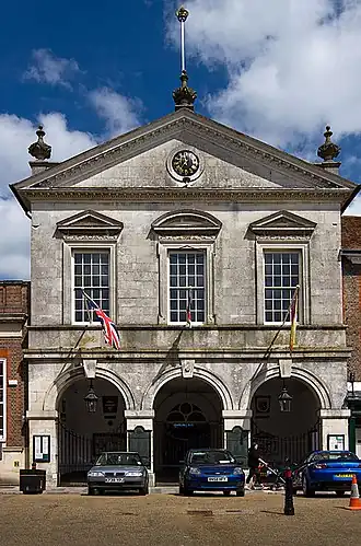 A major fire destroyed the greater part of Blandford, including the old town hall, on 4 June 1731.[5] The local architects and civic leaders, John and William Bastard, decided to take the opportunity to remodel the Market Place, to replace the town hall and the grammar school and to rebuild the Church of St Peter and St Paul.[6] The site they chose for the new town hall was slightly to the north of the old building.[7] The new building was designed in the neoclassical style, built in Portland stone and was completed in 1734.[1][8] The design involved a symmetrical main frontage with three bays facing onto the Market Place; the building was arcaded on the ground floor, so that markets could be held, with an assembly room on the first floor. There was a loggia formed by three large archways with archivolts and wrought iron gates on the ground floor, and there were three sash windows with pediments, the central of which was segmental, on the first floor.[1] At roof level there was a modillioned pediment with a clock in the tympanum.[1] Internally, the principal rooms, which were on the first floor, were the courtroom at the front of the building, and the council chamber, situated behind the courtroom on the left hand side.[1]