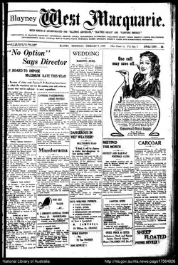- ^ "Blayney West Macqarie". Trove. National Library of Australia. 9 February 1949. p. 1. Retrieved 7 June 2016.