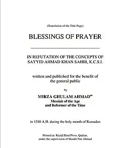 Blessings of Prayer is an English translation of the Urdu book Barakātud-Du‘ā’ by Mirza Ghulam Ahmad, published in 1893. It was written in refutation of Muslim leader Syed Ahmad Khan’s rationalising expositions concerning prayer and as a correction of his principles of Quranic exegesis. The work upholds belief in the miraculous effects of prayer and outlines seven criteria for Quranic interpretation.