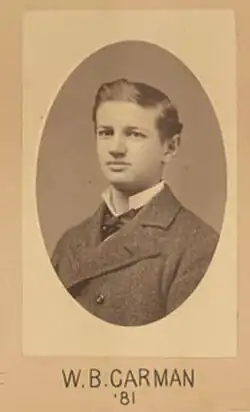 Carman was first educated through a private tutor until 1872 due to medical issues stemmed from a severe nose injury he received at the age of four. Afterwards, he attended the Fredericton Collegiate School where he came under the influence of headmaster George Robert Parkin,[8] who gave him a love of classical literature[9] and introduced him to the poetry of Dante Gabriel Rossetti and Algernon Charles Swinburne.[10] He was later educated at the University of New Brunswick (UNB), from which he received a bachelor's degree in 1881.[9] His first published poem was in the UNB Monthly in 1879. He then spent a year at Oxford and the University of Edinburgh (1882–1883), but returned home to receive his master's degree from UNB in 1884.[11]