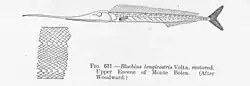 It is one of two known definite genera in the family Blochiidae, alongside Loancorhynchus from earlier in the Eocene of Chile.[4] The indeterminate remains of a Blochius-like fish are known from the Late Paleocene of Peru.[5] Indeterminate blochiid remains are also known from the middle Eocene of Uzbekistan, and from the latest Paleocene/earliest Eocene Danata Formation of Turkmenistan.[6][7] Other potential blochiids such as Acestrus, Aglyptorhynchus, Hemirhabdorhynchus, Cylindracanthus and Congorhynchus are based on highly fragmentary remains and it is thus uncertain if they are blochiids, or even billfish for the last two.[2][8][3] Some authorities have found the Blochiidae to be basal billfish not closely related to any extant groups, whereas others find them to be more closely related to swordfish (Xiphiidae) than to marlins & sailfish (Istiophoridae).[9]