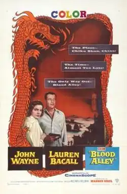 Blood Alley is a 1955 American seafaring Cold War adventure film produced by John Wayne, directed by William A. Wellman, and starring Wayne and Lauren Bacall. The film was distributed by Warner Bros. and shot in CinemaScope and Warnercolor.[2] The film depicts a voyage from Chiku Shan, a village on the Communist Chinese coast, all the way to Hong Kong via the Formosa Strait.[3]