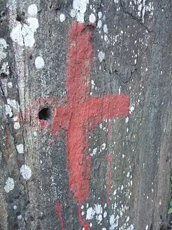 The Blood Road (Norwegian: Blodveien) is a route northeast of Rognan in Saltdal Municipality in Nordland county, Norway that was built by prisoners during the Second World War.[1][2][3] The route was a new section of Norwegian National Road 50 between Rognan and Langset on the east side of Saltdal Fjord (Saltdalsfjorden), where there was a ferry service before the war. The specific incident that gave the road its name was a cross of blood that was painted on a rock cutting in June 1943. The blood came from a prisoner that was shot along the route, and the cross was painted by his brother.[2][4]: 16 [5]