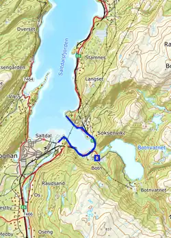 The Blood Road was a road section northeast of Rognan in Saltdal Municipality. The road was a new section of Norwegian National Road 50 between Rognan and Langset on the east side of Saltdal Fjord, where there was a ferry connection before the war.[9]: 46  The Blood Road itself now corresponds to a section of today's European route E6 between Saltnes and Saksenvik.[4]: 24  The prisoners that built the road belonged to the Botn camp.