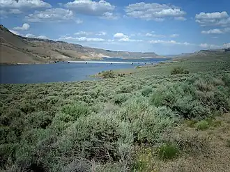 Blue Mesa Dam is located on the Gunnison river approximately 30 miles west of the city of Gunnison, near the intersection of U.S. 50 with Colorado Highway 92, which travels along the top of the dam. The reservoir extends east 20 miles and is composed of three main basins, the Iola, the Cebolla and the Sapinero, from east to west. U.S. 50 traverses the northern shore of both the Iola and Cebolla Basins before crossing the reservoir south on the Middle Bridge and continuing west to the dam.