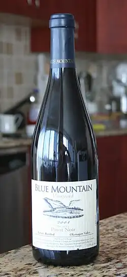 Blue Mountain Vineyard, located on the shore of Vaseux Lake in Okanagan Falls, British Columbia is a Canadian Winery. Situated near the bottom of British Columbia's Okanagan Valley, Blue Mountain produces over 12,000 cases of wine per year. Blue Mountain's tasting room is open by appointment only.