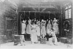 The film features Jehanne d'Alcy in the leading role of Blue Beard's wife, identified as Fatima in the French and American catalogues. Bleuette Bernon plays the fairy. Méliès himself appears in three roles: Blue Beard, one of the kitchen assistants, and the Devil.[2] Méliès's production design for the film is eclectic, mixing Renaissance, Medieval, and Moorish elements as well as a giant modern-day bottle of Champagne Mercier.[2] The final shot is an apotheosis in theatrical style, as would be used at the conclusion of a stage spectacular at Paris venues like the Théâtre du Châtelet.[1] The special effects are created with substitution splices, dissolves, stage machinery, and pyrotechnics.[2]