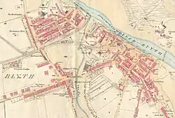 As trade in Blyth continued to grow, so did the population. Development of the Cowpen Quay and Waterloo areas began in about 1810 and 1815 respectively, and between the 1850s and 1890s major house building took place in these areas.[18] Blyth railway station, first built in 1847, was relocated in 1867 and rebuilt by local company J&W Simpson LTD in 1896,[19] to cope with the increase in goods and passenger traffic.[20] The 1890s saw the filling in of "the Slake" (also known as "the Flanker" or "the Gut"). The Slake was a tidal inlet which stretched south from the river, across the site of today's bus station, along the route of Beaconsfield Street, and on past Crofton Mill Pit.[14] Before it was filled in, it almost entirely separated Blyth from Cowpen—Waterloo Bridge providing the only main link. Once it was removed, the two areas could combine and allow the town to begin to take its present form. The town continued to expand in the 20th century; much large-scale house building took place in the 1920s and 1930s, and from the 1950s to the 1970s.[18]