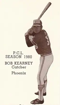 Kearney was drafted by the San Francisco Giants in the fourteenth round of the 1977 Major League Baseball Draft out of the University of Texas.[2] He made his major league debut with the Giants late in the 1979 season, but returned to the minor leagues for the following season.[1] Kearney was drafted by the Oakland Athletics from the Giants in the 1980 minor league draft.[3] Kearney's strong throwing arm was made evident in a game against the Tacoma Indians in 1981 when, he threw out five baserunners attempting to steal second base.[4] He was selected as the catcher for the 1981 Pacific Coast League Northern Division All-Star team.[5]