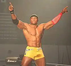 Lashley regained the championship on January 7, 2015, after interference from MVP, King, Samoa Joe and Low Ki, as well as Eric Young turning on Roode.[72] On the June 3 episode of Impact Wrestling, Lashley defeated Eric Young after Chris Melendez distracted Young. At Slammiversary on June 28, Lashley teamed with Mr. Anderson against Ethan Carter III and Tyrus in a losing effort. On the August 12 episode of Impact Wrestling, Lashley defeated Jessie Godderz in a qualifying match for the King of the Mountain match for the vacant TNA King of the Mountain Championship, which was won by PJ Black.[73] On the August 26 episode of Impact Wrestling, Lashley competed in a four-way match for a shot at King of the Mountain Championship, which was won by Bobby Roode.[74] On the September 16 episode of Impact Wrestling, Team TNA (Lashley, Drew Galloway, Davey Richards, Eddie Edwards and Bram) defeated Team GFW (Jeff Jarrett, Eric Young, Chris Mordetzky, Brian Myers and Sonjay Dutt) in a Lethal Lockdown match. On October 4 at Bound for Glory, Lashley unsuccessfully challenged Bobby Roode for the TNA King of the Mountain Championship.[75] During October and November, Lashley began competing in the TNA World Title Series for the opportunity to win the vacant TNA World Heavyweight Championship, where he ended second in his block to successfully advance to round 16 where he defeated Drew Galloway to advance into the quarterfinals and Mahabali Shera to advance the semifinals, but he failed to qualify for the finals when he was defeated by the eventual winner Ethan Carter III.