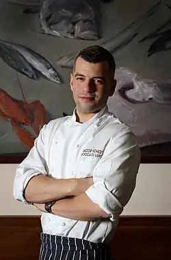In 2012 the menu was described as "changing daily".[4] Noted were the pork and foie gras sausages, and sanguinaccio dolce, a dessert of chocolate pudding flavoured with pig's blood.[5][8]