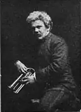 Bohumir Kryl (originally Bohumil Krill, also Bohumír Kryl) was born on May 3, 1875, at Hořice 230, Bohemia, Austria-Hungary.[2][3] He was baptized Catholic 7 days later.[4] His first instrument was the violin, which he studied at age 10.[3] While attending school in Hořice he was classmates with Jan Kubelík, with whom he maintained correspondence.[5] He spent time performing both the violin and the cornet for a circus band in Prague.[3][6] He also performed as an aerialist acrobat with the Rentz Circus in Germany,[7] but an accident in 1886 ended this line of work.[2] His father was a sculptor, and Bohumir also studied this art.[2] He emigrated to the United States in 1889,[3][8] paying the fare in part by performing with the ship's orchestra.[9] After he moved to Chicago, English sculptor H.R. Saunders furthered his profession there. Bohumir followed Saunders to Indianapolis[1] and was soon employed, along with his brother,[10] as a sculptor by General Lew Wallace and also working on the Soldiers' and Sailors' Monument.[2] Simultaneously he joined the When Clothing Company Band, playing the cornet[9] and soloing on this instrument.[2] Before long he was hired by John Philip Sousa, but was fired in 1898 by Sousa because he copied some of the band's music for his own personal use.[11] He then joined Thomas Preston Brooke's Chicago Marine Band, where he spent the next two years.[2] During this time he studied with Weldon of Chicago's Second Regiment Band.[2] In 1901 he spent some time with Phinney's United States Band,[12] but he joined the Duss Band permanently that year.[2] This group was based at Madison Square Garden, at $800 per-month and became its assistant conductor in 1903.[9] This band, led by Frederick Innes, was not as well known, but he was hired as soloist, and the heavy touring schedule and two solos per concert gained him wide exposure.[2] His solos would result in requests for multiple encores.[13] Studying bandleaders Creatore and Vessela, he adopted a wild "lionesque" hairstyle that became his trademark.[2][14] He became acquainted with Joseph Jiran, who owned a Czechoslovak music store in Chicago. With Jiran's encouragement, he formed his own band in 1906[2] styled as Kryl's Bohemian Band by 1910[3] with the Cimera brothers.[15] This group worked for Columbia, Victor, and Zonophone, recording works by such composers as Smetana, Dvorak, and Safranek.[3] He earned the distinction of the first Czech musician to record on phonograph cylinders.[1] Kryl's older brother František Xaverský (Frank) Kryl became a band-leader in Chicago.[16] An even older brother Jan Křtitel (John) was president of the Pilsen Foundry & Iron Works there.[17]