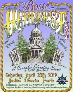 Boise Hempfest is an annual cannabis rights activist event and festival in Boise, Idaho, which has been held since 2016.[1] The "Hempfest" name is licensed by Seattle Hempfest.[2] The coordinator of the inaugural and subsequent events was Serra Frank.[3] The fourth annual event took place on April 20, 2019.[4] The 2020 event was scheduled for April 18, 2020; but was postponed due to the Idaho government mandated "stay at home order" issued at the beginning of the COVID-19 Pandemic.[5]