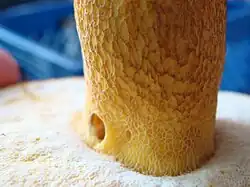 Initially pale yellow to yellow, the pore surface develops olive tinges as it matures, and often becomes depressed near the stem attachment. Pores are circular to angular, and minute—typically less than 1 mm wide; the tubes are 1–2.5 cm (0.4–1.0 in) deep. The golden-yellow stem is 7–10 cm (2.8–3.9 in) long by 2–3 cm (0.8–1.2 in) thick. Young stems are typically bulbous to club-shaped, but this evens out somewhat as the mushroom grows, and mature stems are club-shaped to nearly equal in width throughout. The stem is dry, solid (i.e., not hollow), and features yellow reticulation, at least on the upper portion.[9] Mycelia at the base of the stem have a buff color.[11] The fruit body does not have a partial veil or a ring on the stem.[9] Boletus auripes is edible.[12][13]