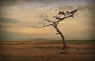 The 972 square kilometres (375 sq mi) catchment area of the lake is located in a forest steppe zone. The lakeshore is low and gentle, with grassland and bushes. Bolshoy Yeravna has a roughly round shape and is fed by three small rivers, the Tuldun, Indola and Zhipkesen. In the southwestern side it has an outlet, a small sound connecting with neighboring Lake Sosnovo. To the east lies Maly Yeravna lake.[1] When the water levels are high the Yeravna lakes are connected with each other by intermittent channels. The outlet of the lake area is via the Khorga lakes to the northeast through the Kholoy, a small, shallow tributary of the Vitim River flowing from Isinga lake at the northeastern end.[3]