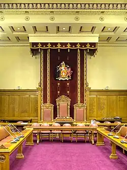Internally, as originally constructed, the building was arranged around the central Great Hall, which was 112 feet (34 m) long by 56 feet (17 m) wide; it contained a sizeable organ by Gray and Davison and was designed to seat 1,500 people.[11] There was a Sessions Court to the west; the Council Chamber was on the upper floor to the north and the Mayor's state rooms were on the same floor to the east (including a banqueting room and, directly under the clock tower, a grand reception room). The ground floor had offices and rooms for various officials and users of the court, and to the east the Borough Surveyor and Borough Treasurer's offices. The basement level included a cell block directly below the courtroom, offices and amenities for the police (including a drill-hall directly below the Grand Hall), along with kitchens and storerooms and various civic amenity offices (which could be accessed directly via their own entrances by members of the public).[11]