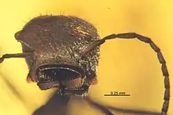 The head is small and wider than long, with a generally triangular outline in dorsal view.[1] The upper surface is thickened into a shield with a curved and raised profile and two elongated processes extend out and slightly forward from the rear of the head.[1] The eyes are either reduced to such a degree that they are not visible, or are possibly lost all together, and no ocelli are visible.[1] The clypeus is small and strongly curved, with the front margin that faces the inner sides of the mandibles covered in 25, 0.01 mm (0.00039 in) long, peg-like setae. Each mandible is curved almost 90˚ with the bases covered by the edges of the clypeus lobes. On the mandible's ends are two teeth, a smaller sub-apical one and a larger apical one with a groove that likely matches the position of the opposite mandible placement when they are closed. The antennae are distinctly 11-segmented, with a curved scape that just reaches the rear margin of the head capsule when reclined.[1]