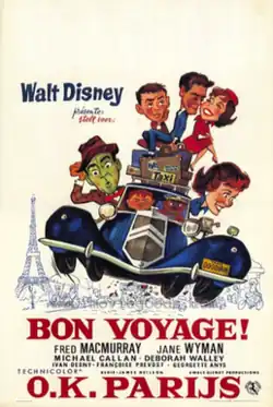 Bon Voyage! is a 1962 American comedy film directed by James Neilson and produced by Walt Disney Productions. It stars Fred MacMurray, Jane Wyman, Deborah Walley, Tommy Kirk, and Kevin Corcoran as the Willard family on a European holiday. The character actor James Millhollin appears in the film as the ship's librarian.[3]