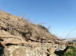 A further major landslip, the worst on the island since 1994, took place on the evening of 10 December 2023.[9] Ground movement had occurred over October and November[10] with wet weather throughout August being blamed.[11] Following the December landslide, the nearby Leeson Road was immediately closed with 20 households being evacuated.[9] An area of former woodland extending about a quarter of a mile along the coast beneath the cliff, including picturesque woodland paths, and incorporating part of the Isle of Wight Coastal Path, was completely obliterated. It was initially reported that the Devil's Chimney, a scenic rock cleft, had been destroyed,[12] but subsequent footage appears to show that it remains intact, although now inaccessible to the public.[13][14] The Wishing Seat and the "Chink", both of which are located to the north of the destroyed area, also survived the landslip, though these too are inaccessible as the paths to them have been closed for safety reasons.