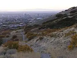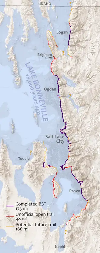 The Bonneville Shoreline Trail (BST) is a mixed use (biking/hiking) recreation trail in Utah that roughly follows the shoreline of the ancient Lake Bonneville, a prehistoric pluvial lake which existed in northern Utah before naturally draining about 14,000 years ago.[1][2] It closely follows the Wildland–urban interface between the Wasatch Front metropolitan area and the Wasatch Mountains. Some sections of the trail are complete while other parts are still being developed. The Bonneville Shoreline Trail hopes to one day stretch from the Idaho border (north of Logan, Utah) and run southward all the way to Nephi, Utah. In recent years, the vision has also extended to include the western edge of Utah and Salt Lake Valleys.